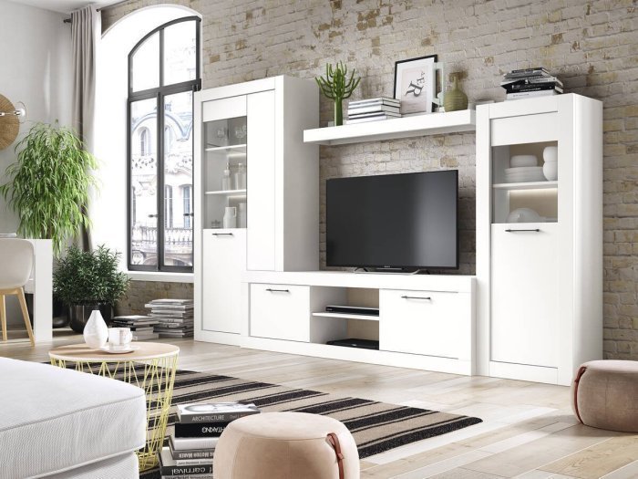 El Mueble Modular DAKOTA es el equilibrio perfecto entre funcionalidad y belleza. Compuesto por un mueble bajo para TV con puerta y estante, junto a una vitrina alta y otra de ae altura media. Este conjunto te ofrece prácticas soluciones de almacenamiento sin sacrificar su elegante presentación.