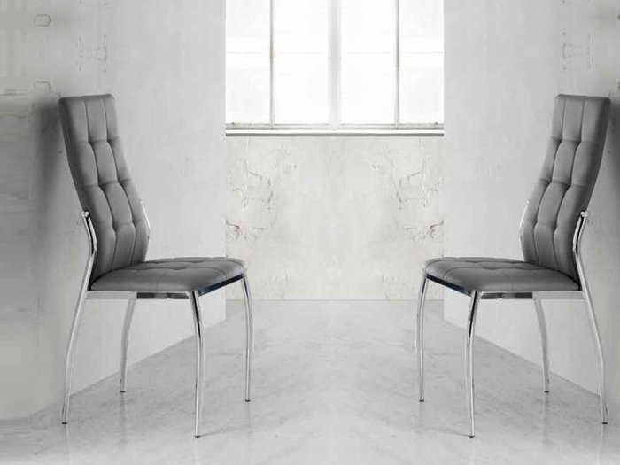 Patas cromadas con asiento y respaldo tapizados en polipiel con costuras decorativas.