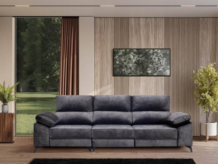 Tapizado en tela tipo chenilla de tacto suave. Hilo contrastado. Tratamiento Acualine antimanchas. Asientos y respaldos desenfundables.