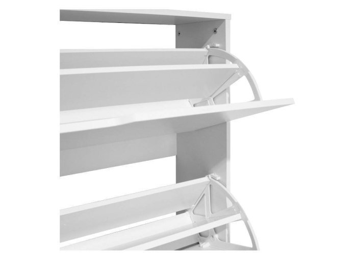 Armario zapatero con dos puertas que se abren hacia afuera, lo cual facilita el acceso y la visibilidad de los zapatos guardados en su interior. Además, al ser abatibles, las puertas no ocupan espacio extra al abrirse, lo que lo hace ideal para habitaciones pequeñas.
