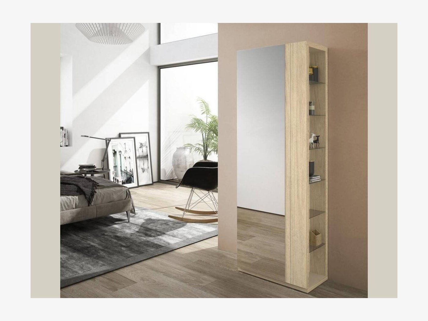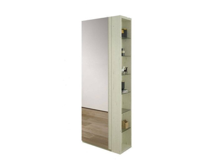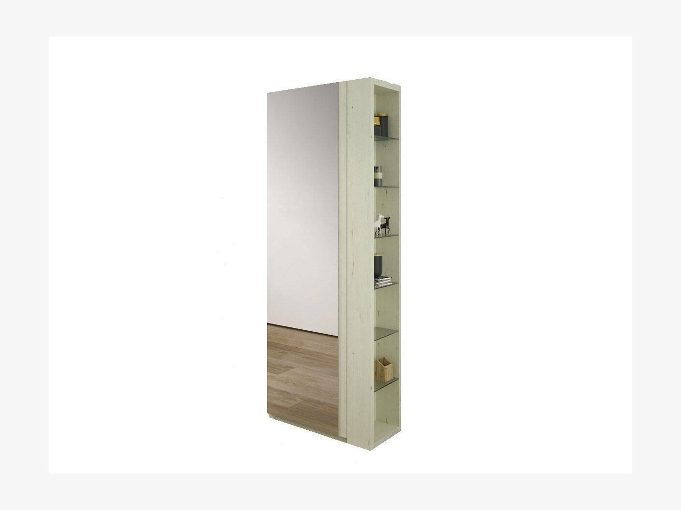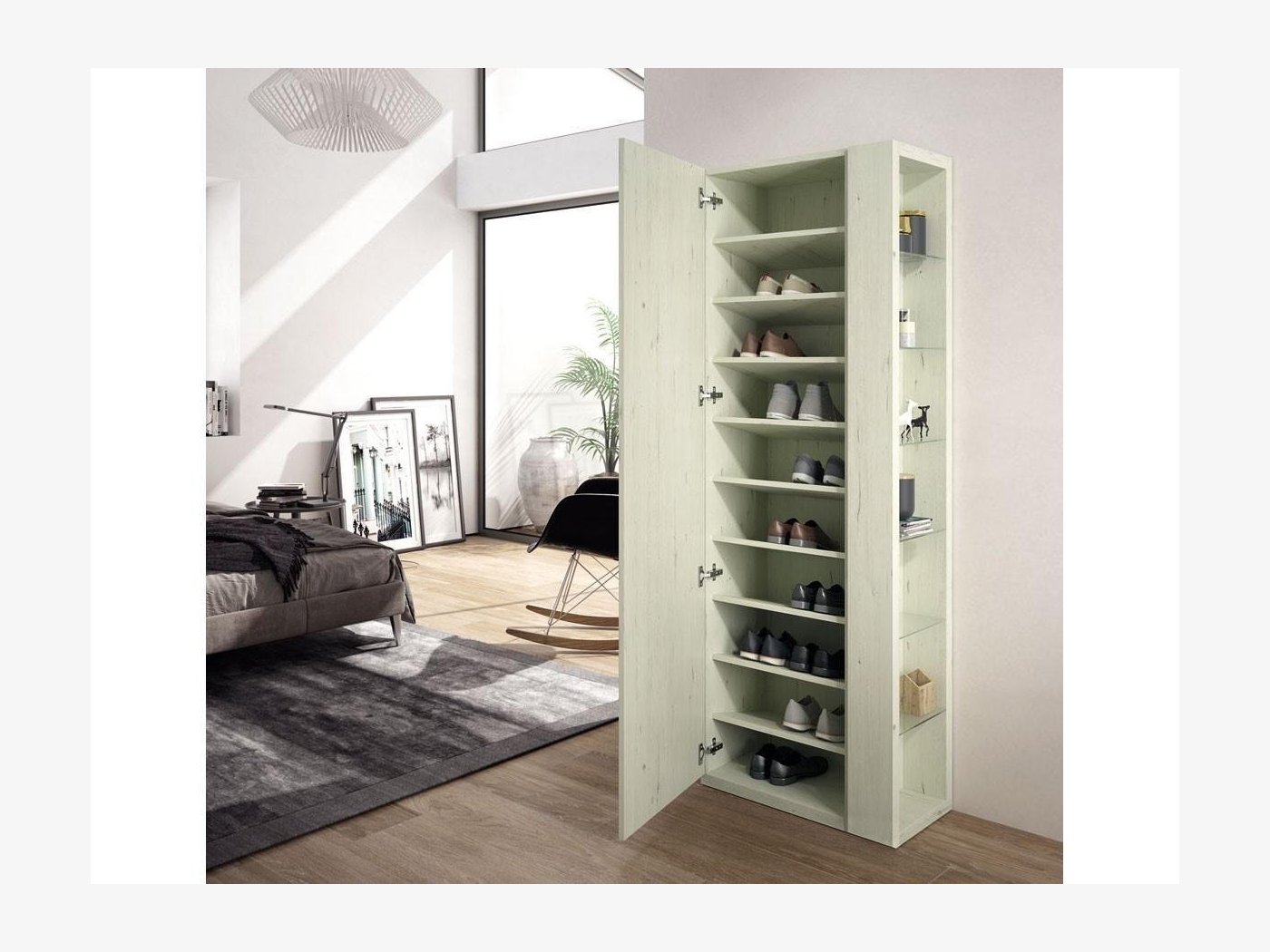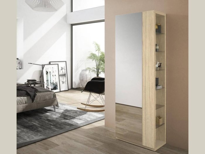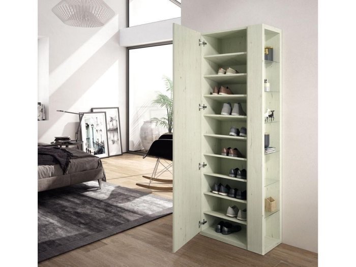Mueble zapatero con 9 baldas inclinadas que almacenan hasta +/- 20 pares de zapatos. Apertura con 1 puerta de espejo y una estanteria adicional en el lateral para augmentar su capacidad de almacenamiento y funcionalidad. Disponible en varios colores a elegir.